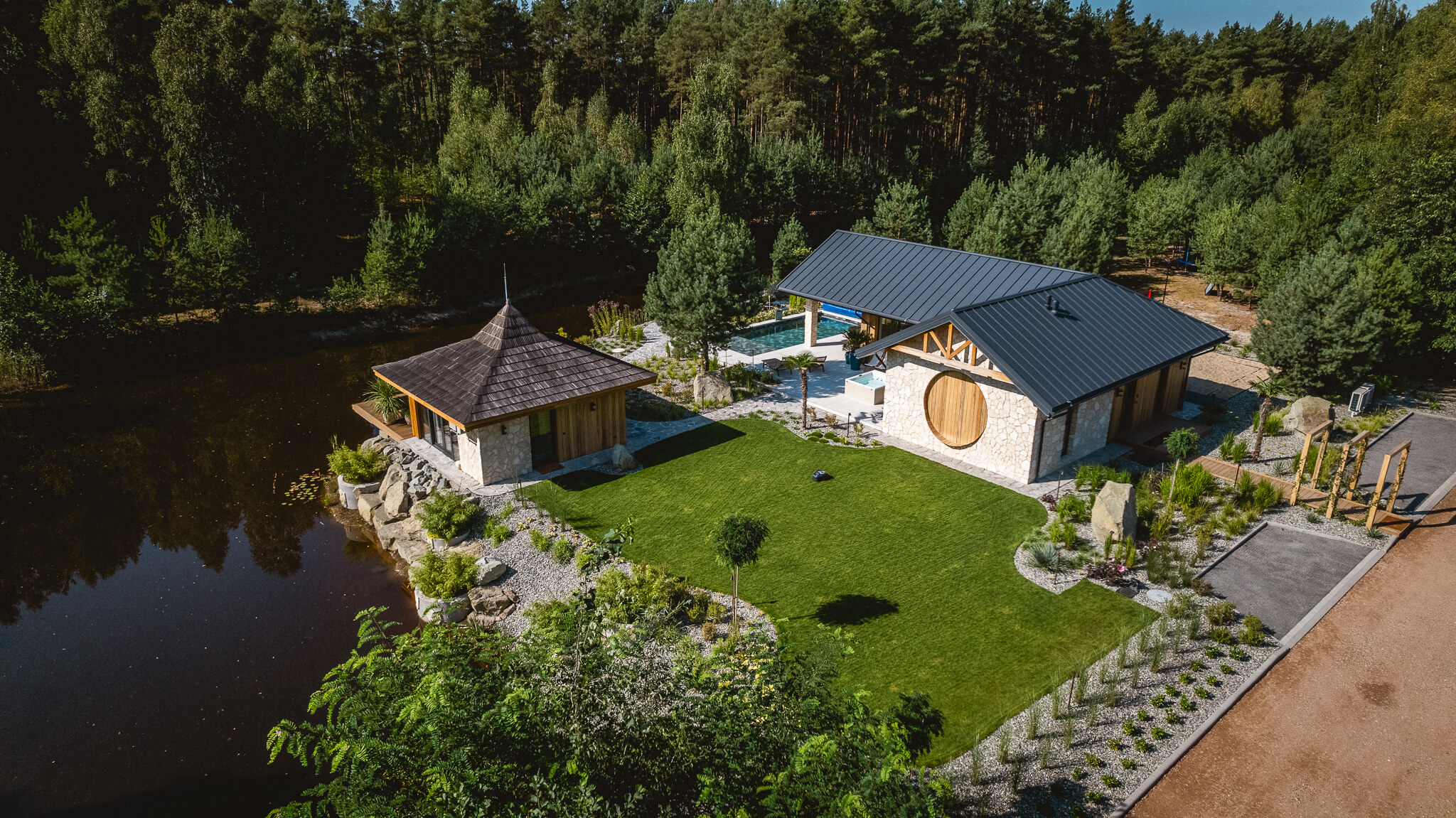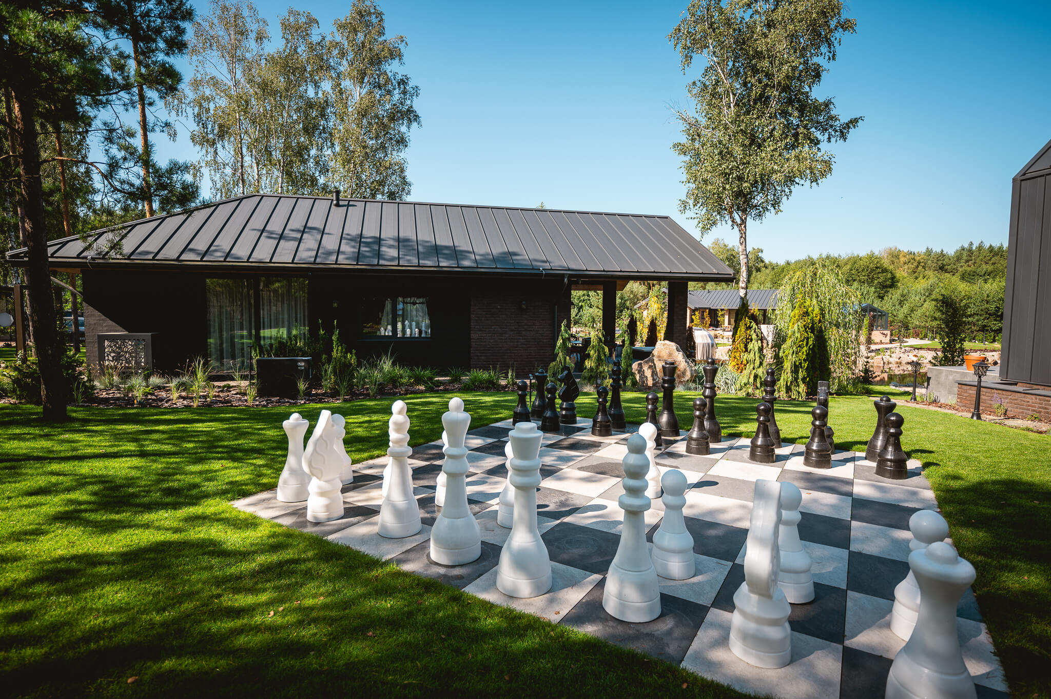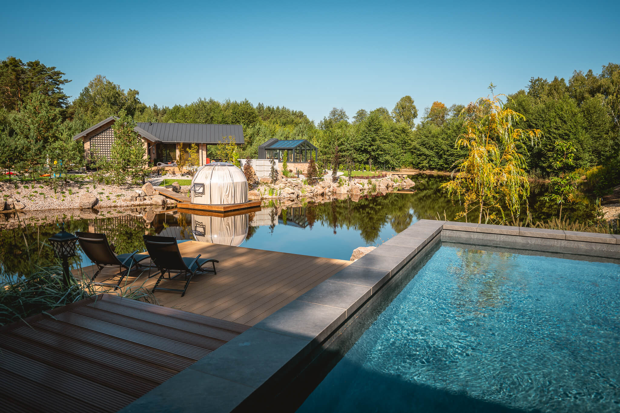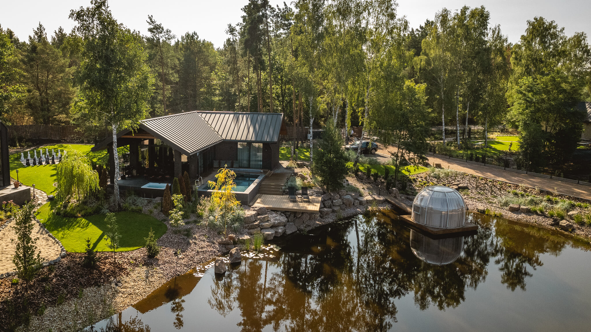 To miejsce, w którym klasyczna elegancja spotyka się z totalnym spokojem natury. Położony nad samym stawem, pośrodku lasu, oferuje widok, który mógłby rozproszyć nawet doktora Watsona w trakcie śledztwa.