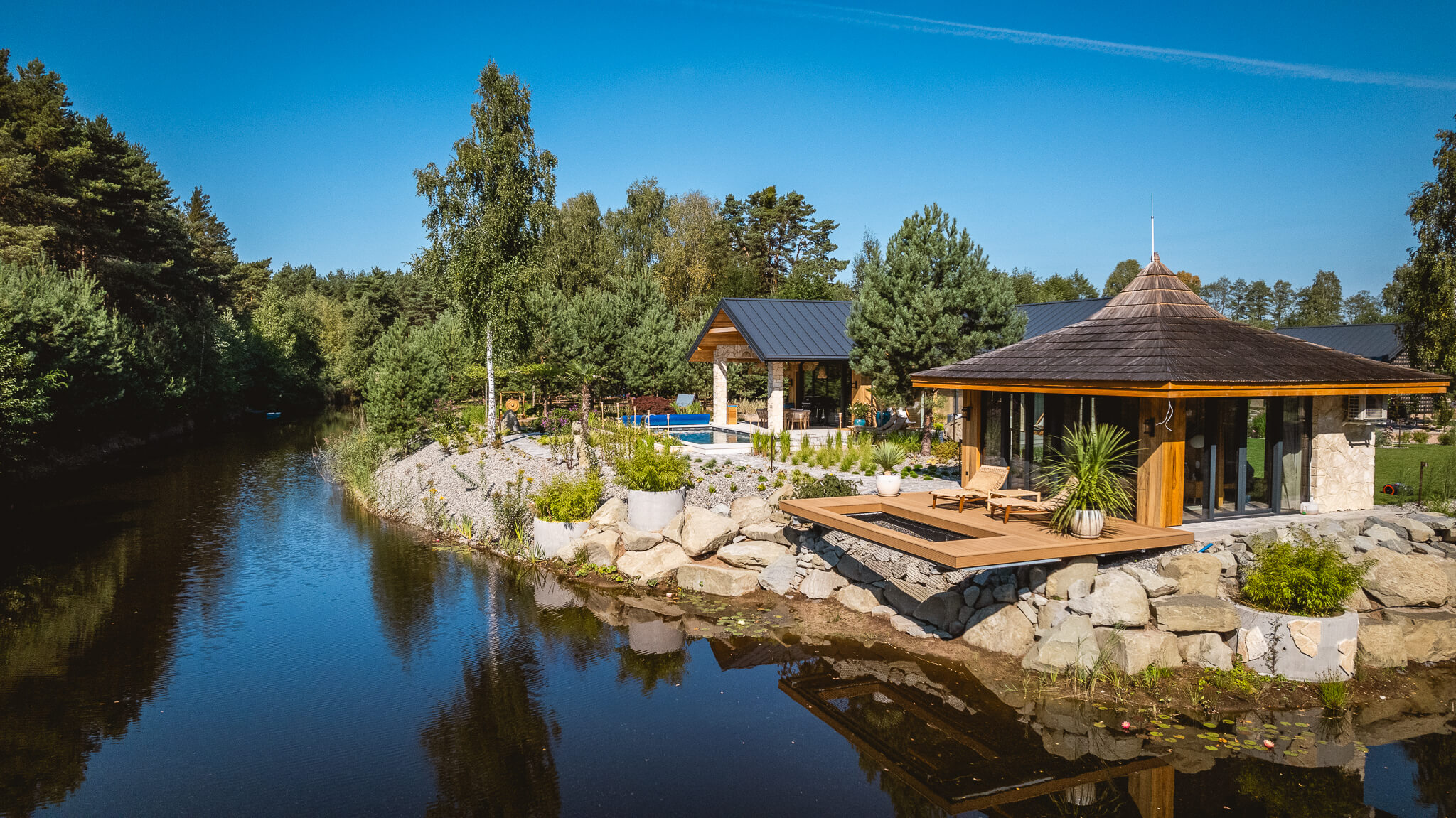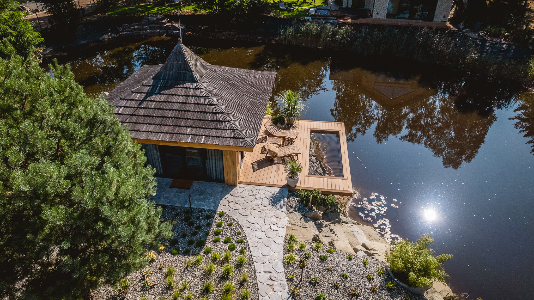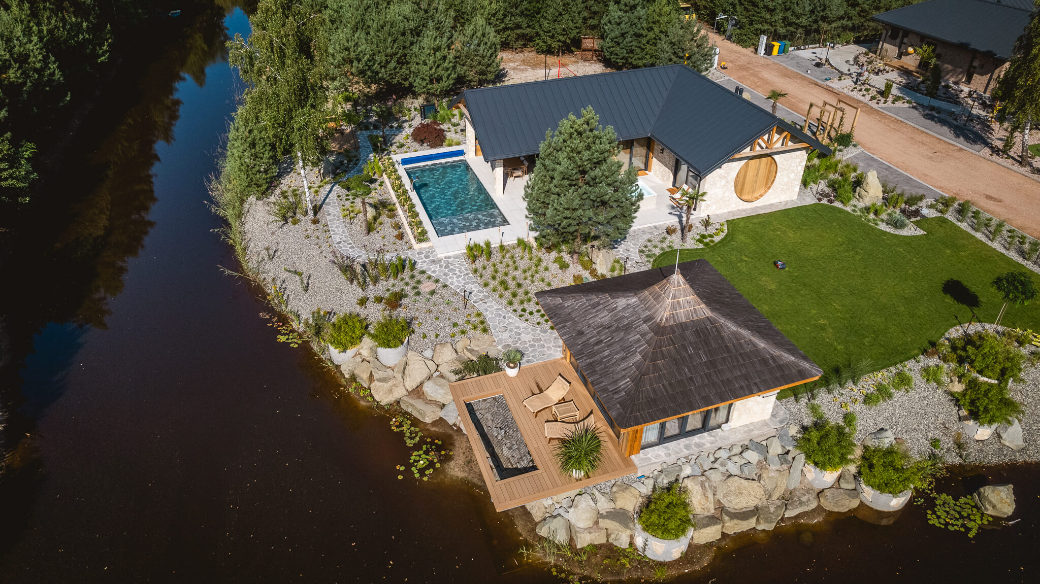 Każdy element domu i ogrodu został zaprojektowany tak, byście poczuli się jak w odległym, tropikalnym zakątku świata. Pomaga w tym również sama lokalizacja, na półwyspie, który od pierwszego kroku nadaje temu miejscu wyspiarski charakter. To dom dla tych, którzy marzą o klimacie Bali, nie opuszczając Mazowsza.