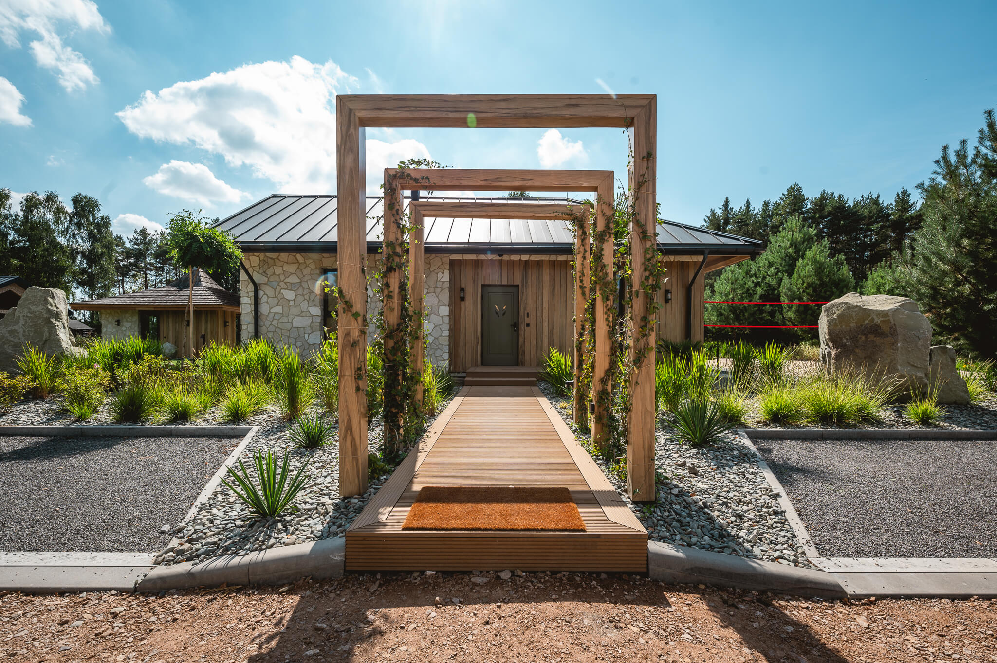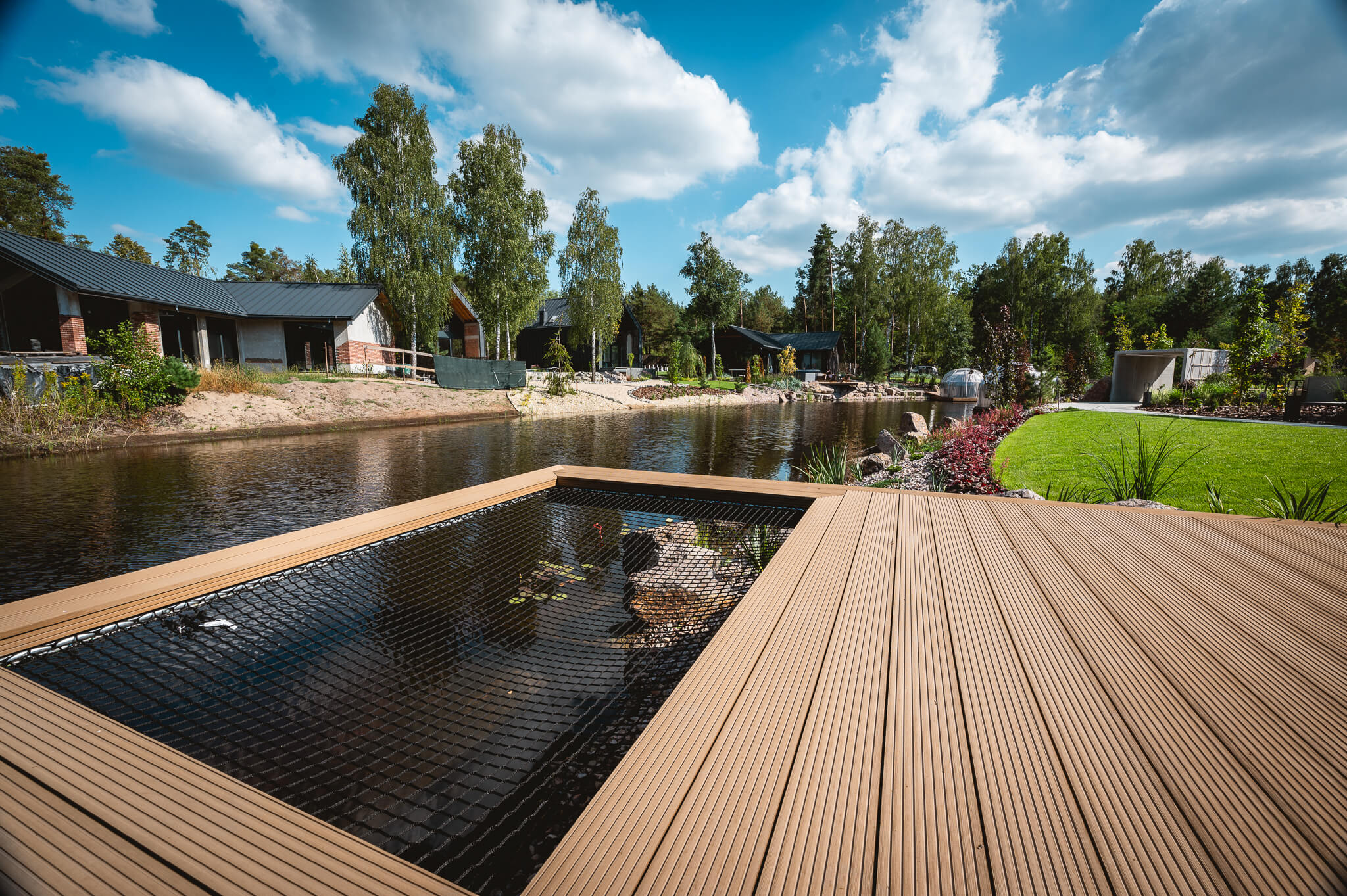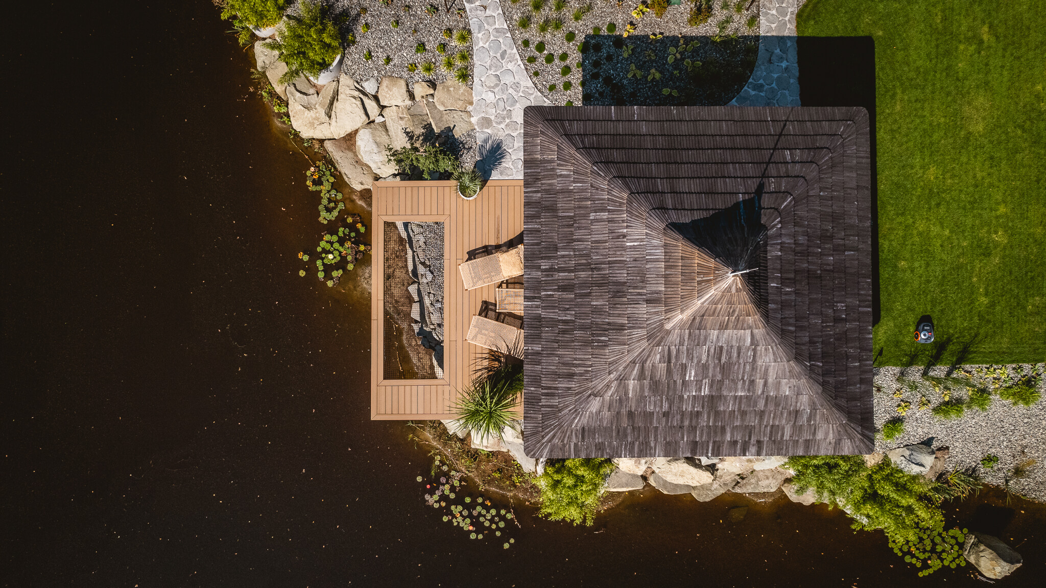 Każdy element domu i ogrodu został zaprojektowany tak, byście poczuli się jak w odległym, tropikalnym zakątku świata. Pomaga w tym również sama lokalizacja, na półwyspie, który od pierwszego kroku nadaje temu miejscu wyspiarski charakter. To dom dla tych, którzy marzą o klimacie Bali, nie opuszczając Mazowsza.